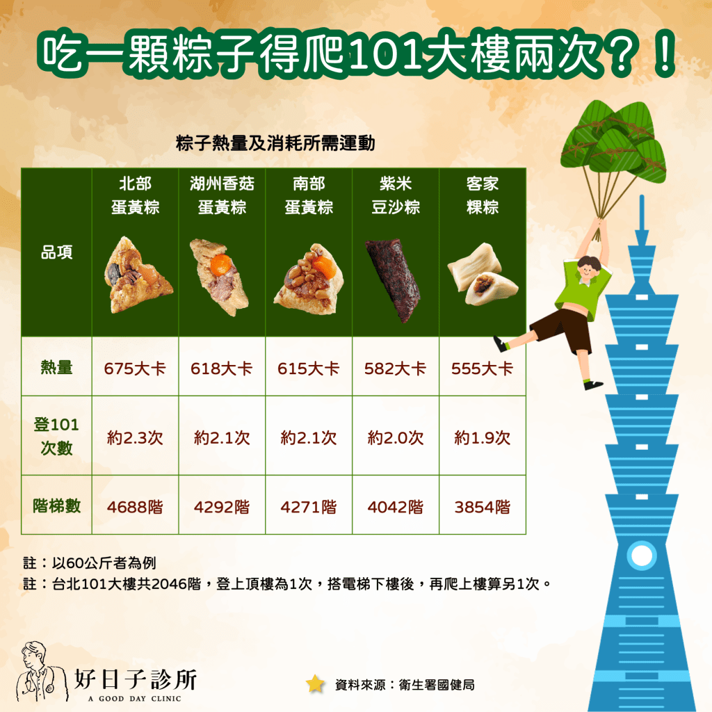 端午節不能少的,就是肉粽了!但是大家要小心喔,粽子熱量很高,吃一顆粽子得爬101大樓兩次才能消耗掉!(參考圖一)