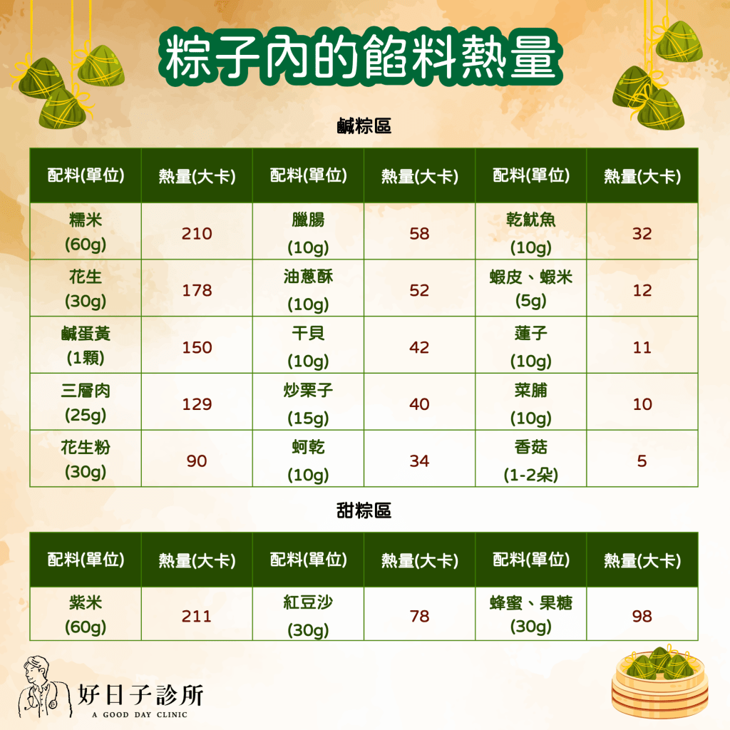 除了糯米本身熱量很高之外,粽子內的餡料熱量也是很高(參考圖二),食用時適時挑出一些高熱量的配料(夾到討厭的人的碗裡…😆),可以減低熱量的攝取。