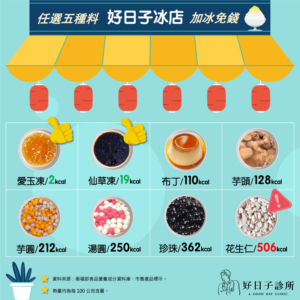 如果想吃剉冰,就是挑「愛玉+仙草+一個你很喜歡吃的料」,再請老闆糖水加少一點,這樣能夠拉低熱量平均值,又能吃到自己想吃的。