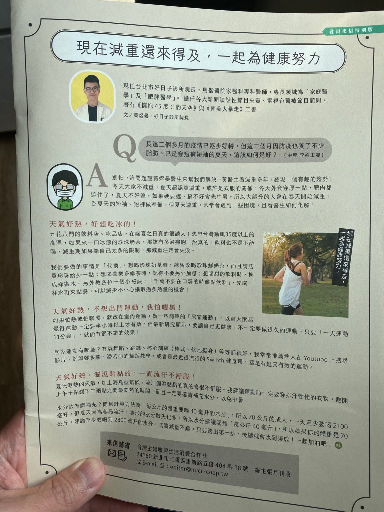 黃醫師應綠主張月刊邀約,於專欄回覆讀者關於「夏天減重」的問題,或許糰子們也會有一樣的疑問,在這裡跟大家分享
