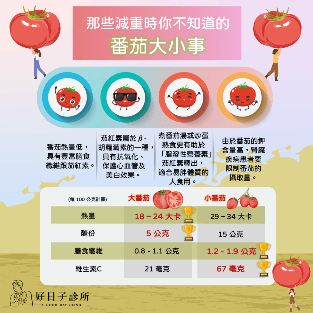 大番茄醣份為5公克(大約為小番茄1/3);小番茄熱量為醣份15公克。