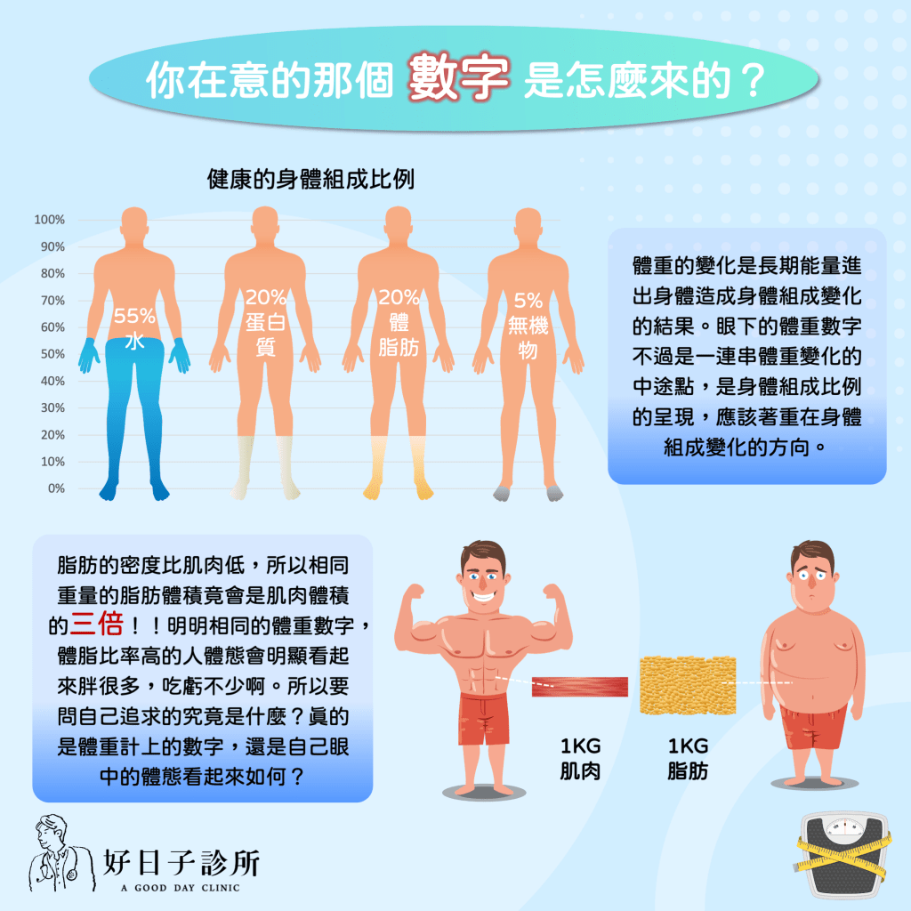 這個觀念很重要,所以說三次,眼下的體重數字不過是一連串體重變化的中途點,是身體組成比例的呈現,應該著重在身體組成變化的方向。