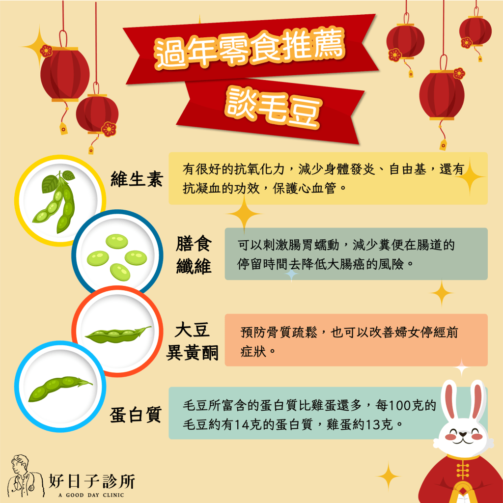 所以過年時,不妨在家放一包冷凍毛豆,需要時微波加熱來吃,不僅可以有飽足感又可以滿足一下口腹之慾,也可以吃得更健康、補充更多蛋白質。