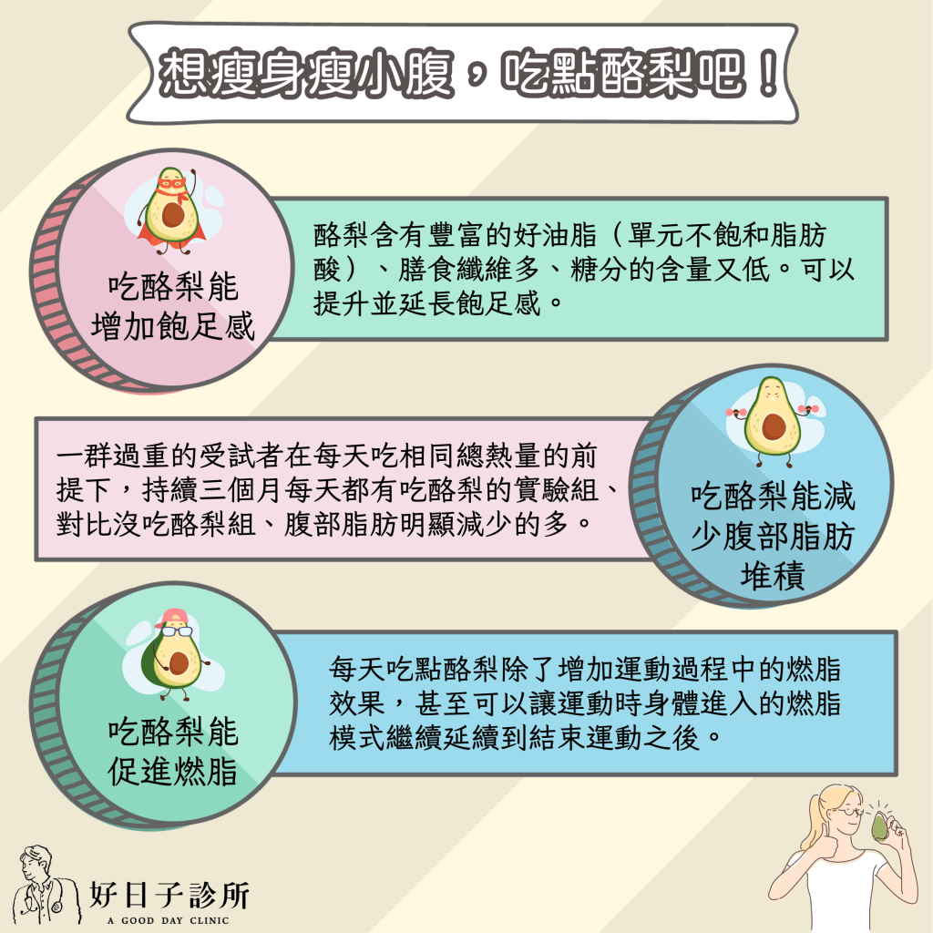 還有另個研究指出:每天攝取到好油脂可以預防脂肪集中堆積腹部。含有豐富好油脂的酪梨就是一個優質的選擇!