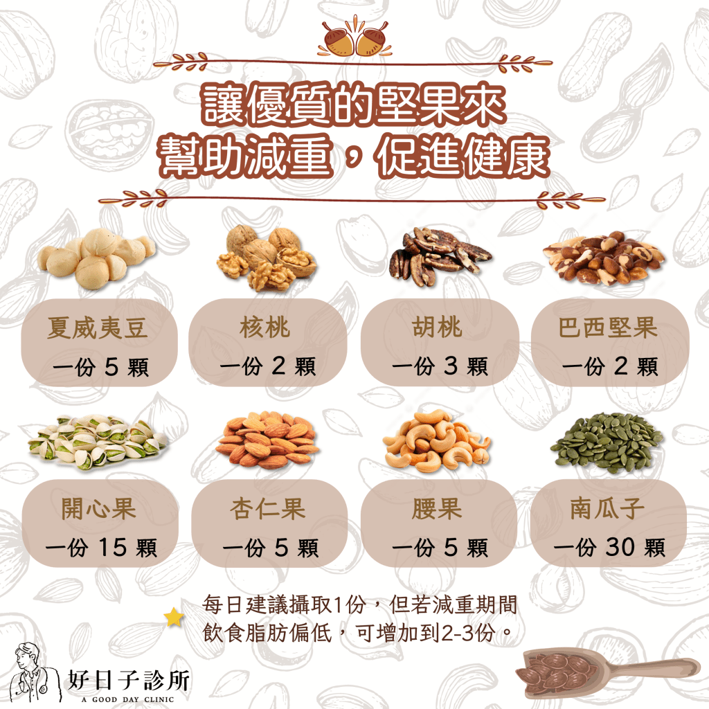 脂肪是重要的營養素,如果減重期間飲食中脂肪偏低,堅果攝取的分數可增加2-3份以補足足夠的脂肪。