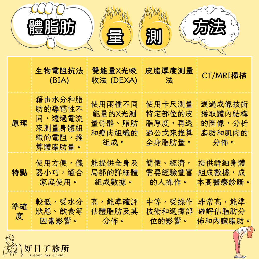 在減重過程中,除了關心體重的變化,我們更希望能減掉脂肪。不過你知道除了體脂機以外,還有其他許多量測體脂肪的方式嗎?