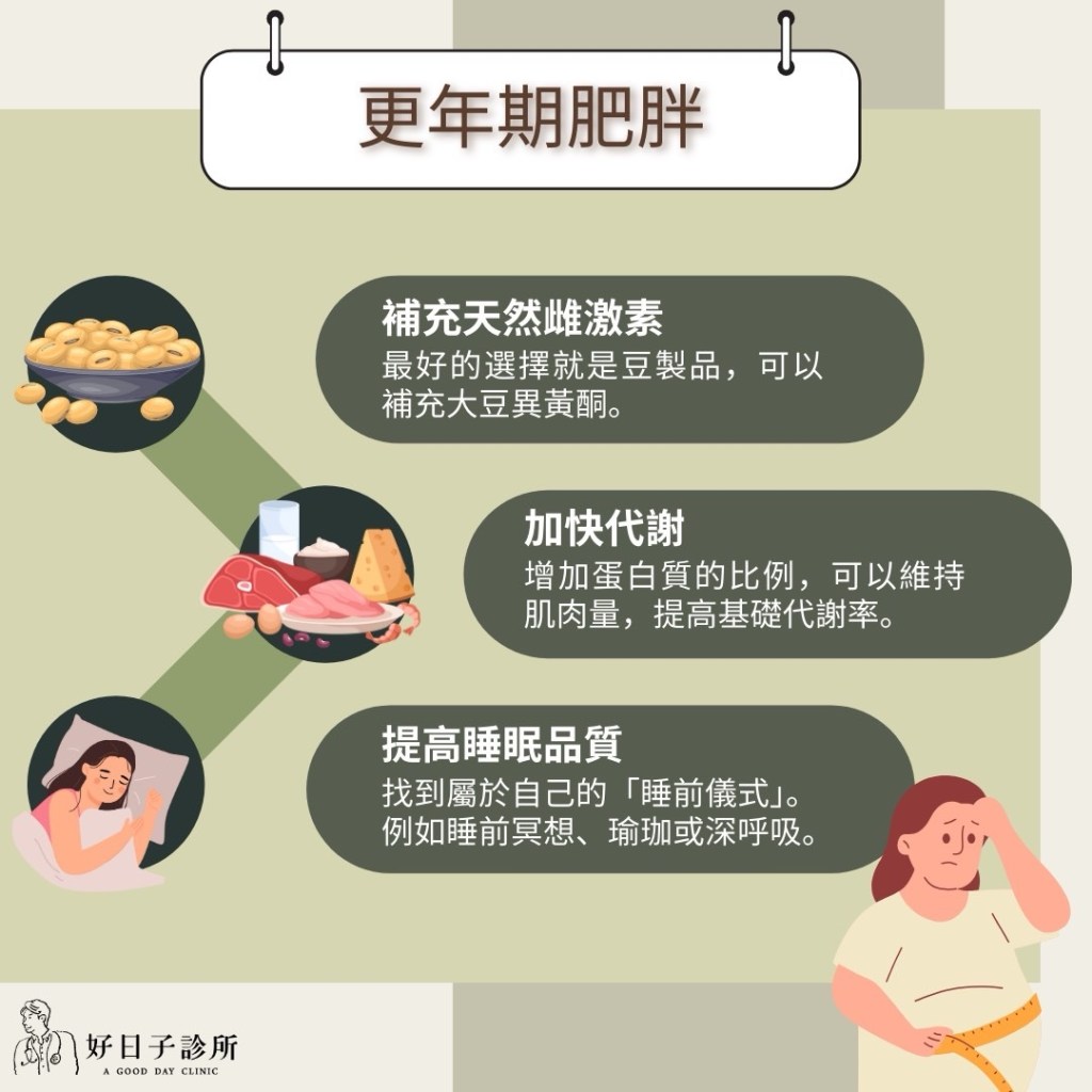 更年期常伴隨失眠或夜間盜汗,影響瘦素(Leptin)與飢餓素(Ghrelin)的平衡,使人食慾增加。