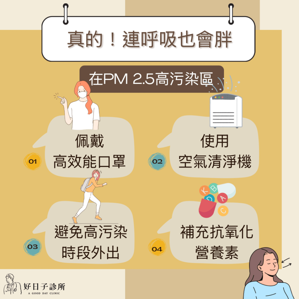 在PM 2.5高污染區,佩戴高效能口罩、使用空氣清淨機、避免高污染時段外出,並補充抗氧化營養素,這些也有利減重喔!