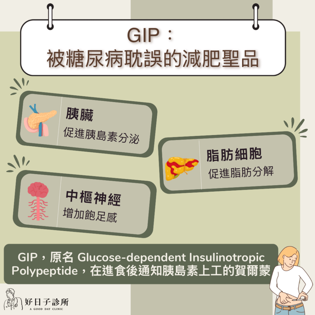 後來大家才發現GIP還能作用在脂肪及大腦,提升脂肪代及調節飽足感,是個被糖尿病耽誤的減肥聖品。