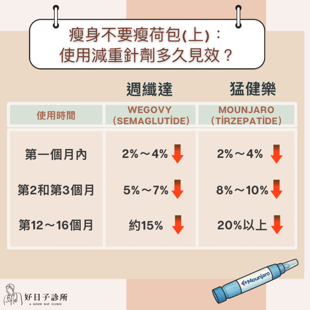 一般而言,持續使用Wegovy 3個月後,可減去原始體重的5%~7%;Mounjaro 則可能達到8%~10%。