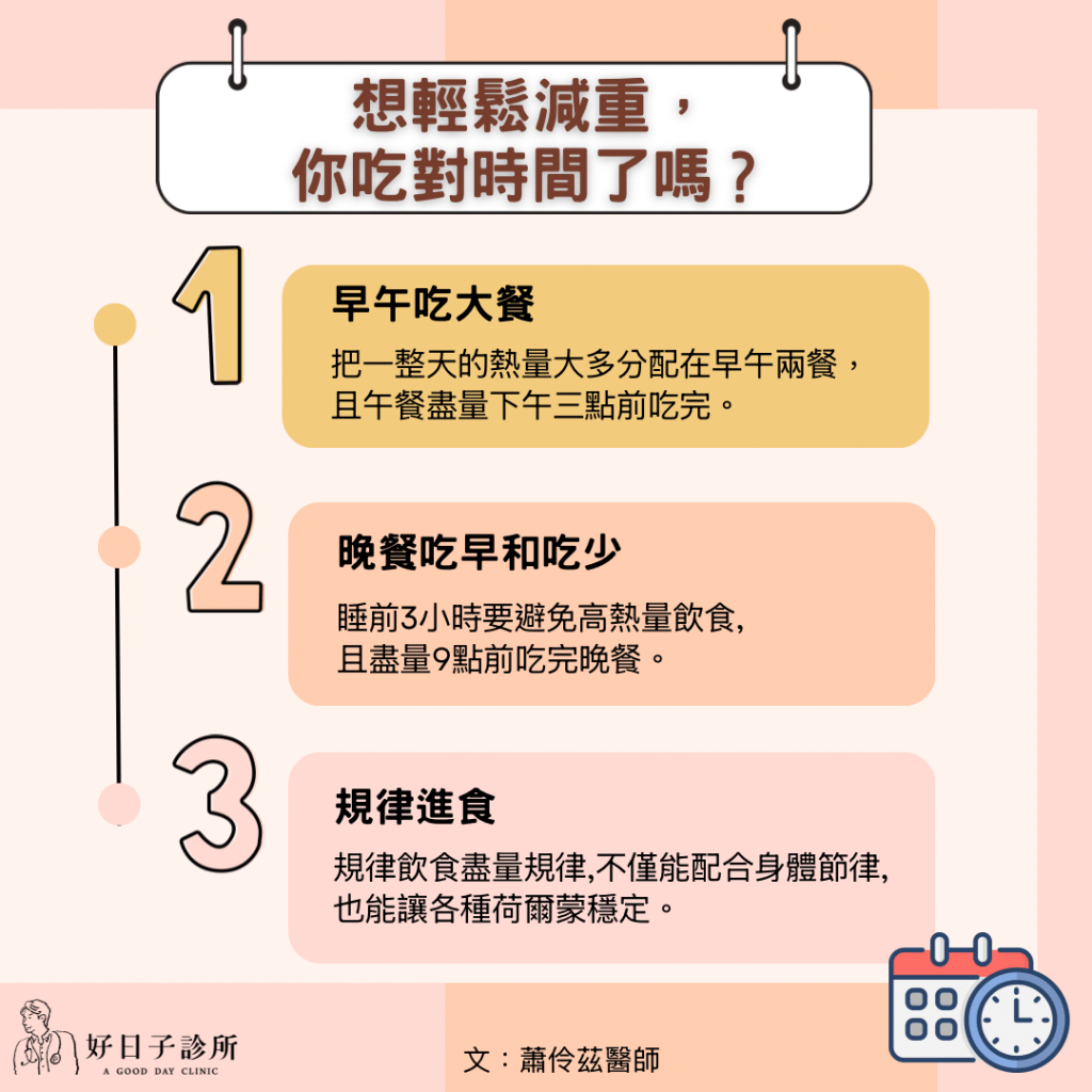 3.規律進食:規律飲食盡量規律,不僅能配合身體節律,也能讓各種荷爾蒙穩定。