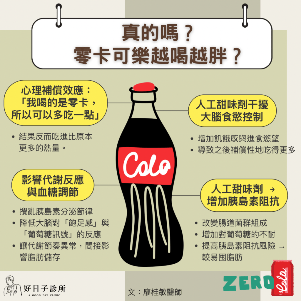 - 比含糖飲料好嗎? → 如果替代的是「大量含糖飲料」,零卡飲料仍然比較好;但若完全靠它「減肥」,效果可能適得其反