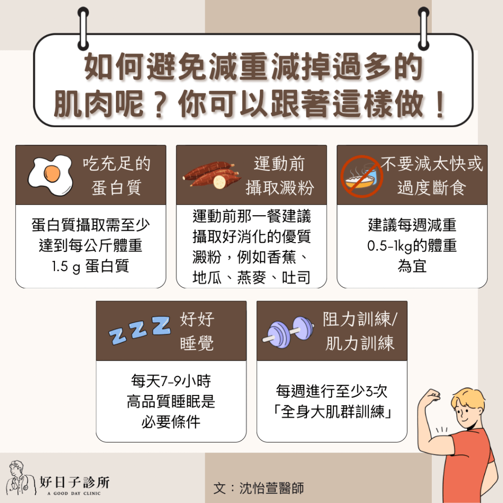減重過程中,我們最怕的不是減太慢,而是掉體重的同時連肌肉也一起掉。不僅會影響基礎代謝,體內的肌肉量也同時會影響整體線條和健康;在看門診時,我們常常遇到有重訓習慣的個案,希望以減脂為主,不希望減到肌肉。