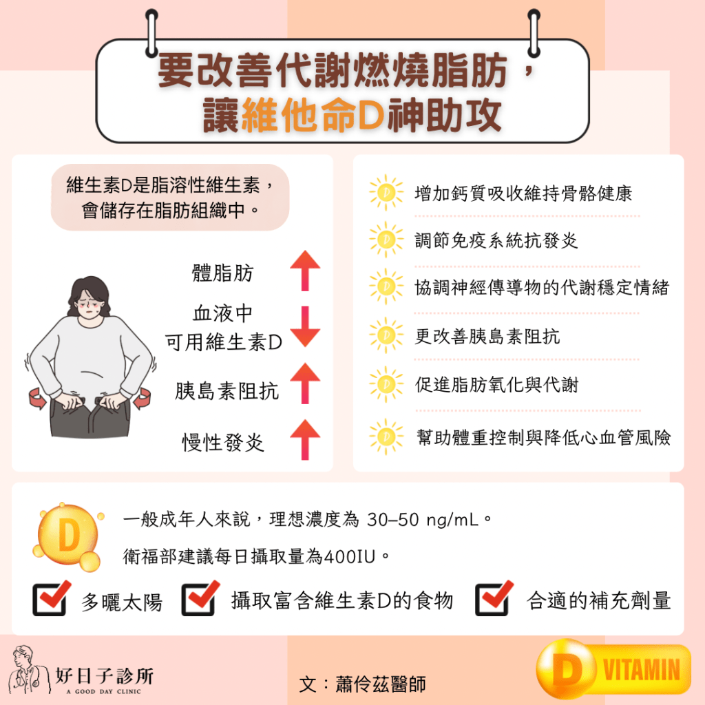 維生素D是身體很重要的維生素之一,它不僅能增加鈣質吸收維持骨骼健康,也能調節免疫系統抗發炎,協調神經傳導物的代謝穩定情緒,更改善胰島素阻抗,促進脂肪氧化與代謝,進而幫助體重控制與降低心血管風險。