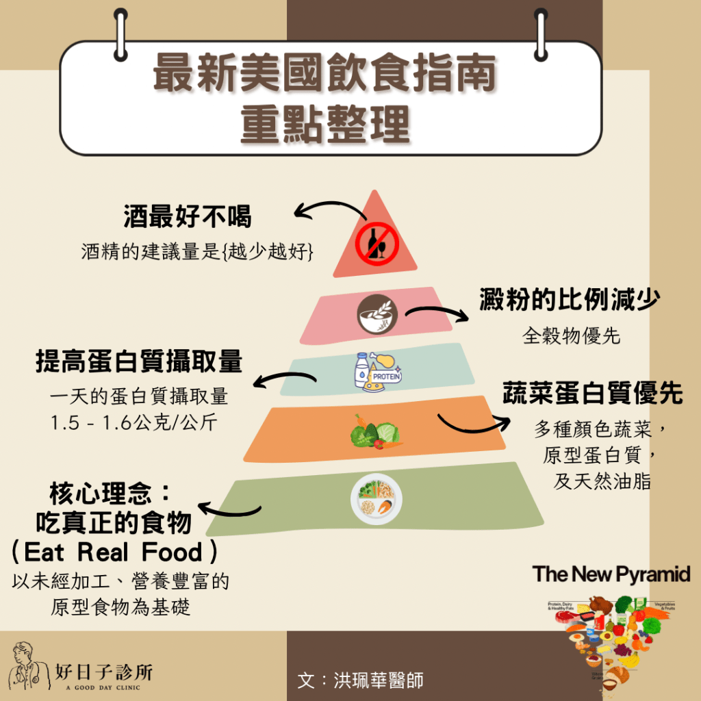 2025-2030年版的《美國飲食指南》(Dietary Guidelines for Americans)已於 2026年1月7日 正式發佈。這個”倒金字塔”的飲食建議,和過去的正金字塔可是大不相同。我們來看看有那些改變: