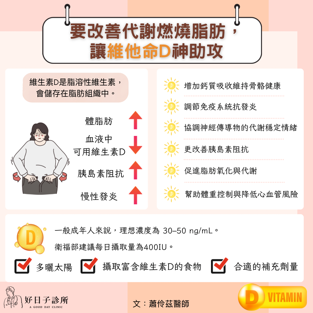 30秒談減重|要改善代謝燃燒脂肪,讓維他命D神助攻 (文: 蕭伶茲醫師)